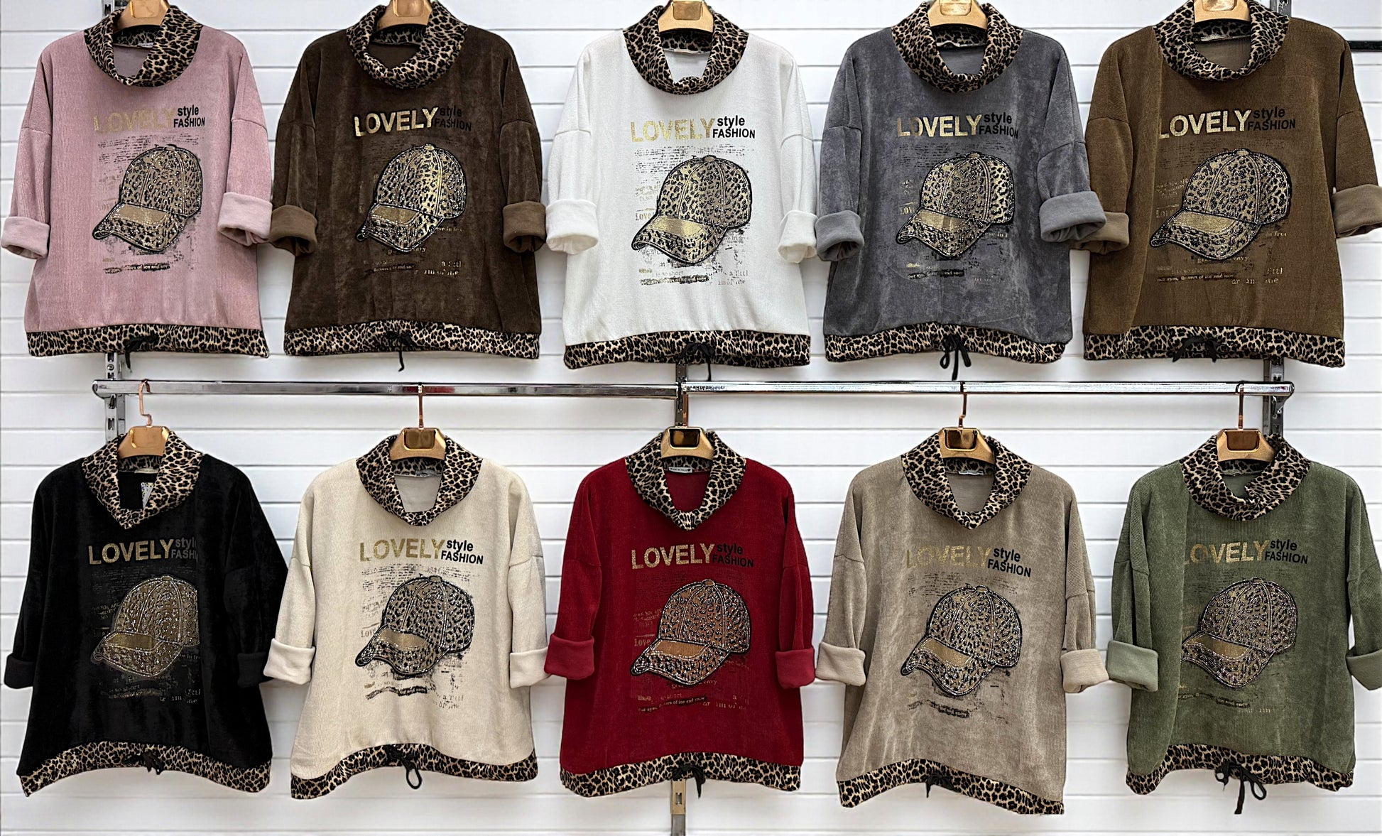 Damen Feincord-Sweatshirt mit Leo-Schalkragen, „LOVELY“ Cap-Motiv & Kordelsaum – viele Farben