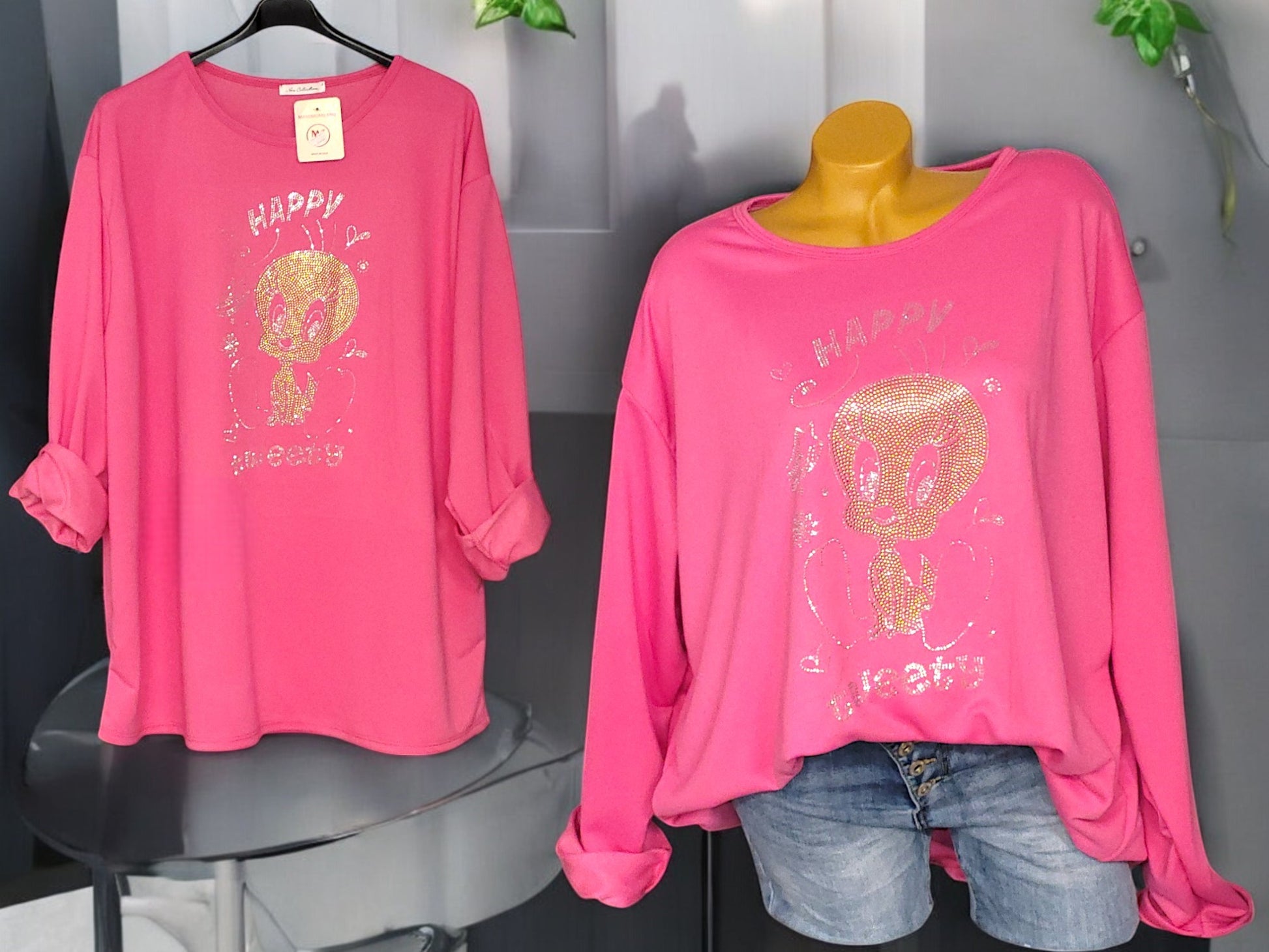 Dieses Shirt ist die perfekte Wahl für alle, die Komfort und Stil lieben. Kombinieren Sie es zu Ihrer Lieblingshose oder Ihrem Lieblingsrock und setzen Sie mit dem glitzernden Tweety-Motiv ein Statement! Ideal für Alltag und Freizeit – ein echtes Must-have für Tweety-Fans.
