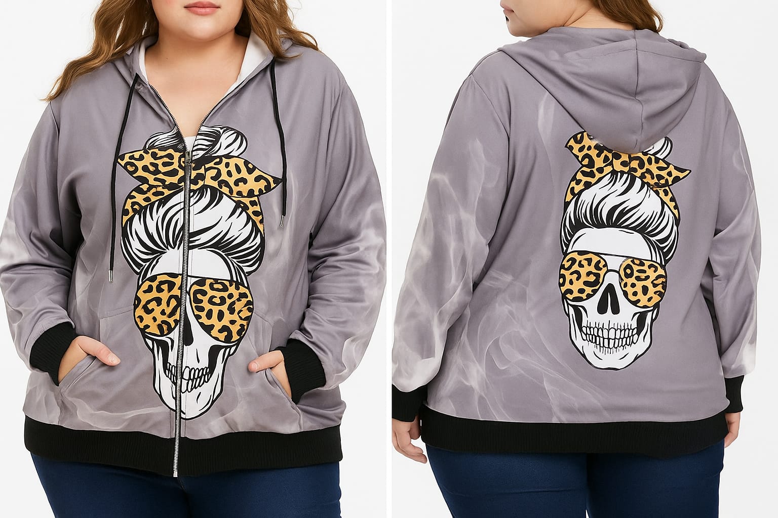 🖤💀🕶️ Lässige Kapuzenjacke in Übergröße Größe 46-52 – Auffälliger Skull-Leopard-Print!