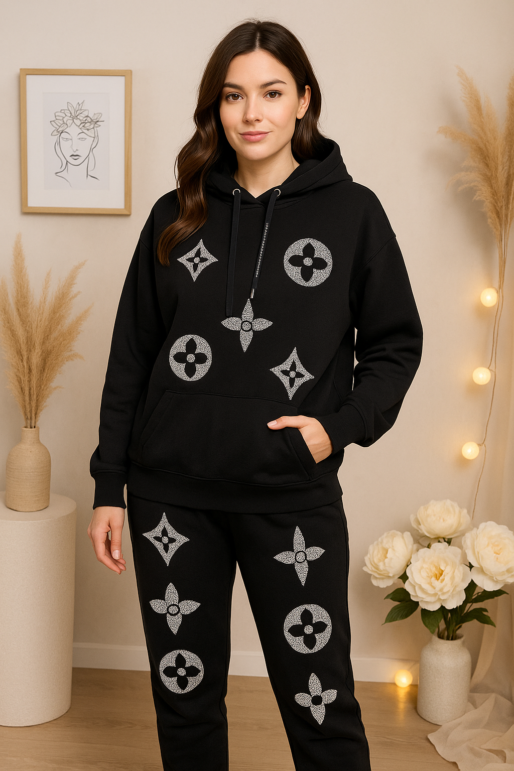 Glanz trifft auf Komfort! ✨ Dieser edle Zweiteiler aus hochwertigem Butterstoff vereint lässige Eleganz mit einem Hauch Glamour. Die mit funkelnden Strasssteinchen verzierten Symbole auf Hoodie und Hose machen das Set zu einem echten Hingucker – perfekt für Fashionistas, die Komfort und Stil lieben. 💎